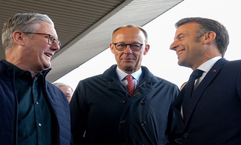 في هذه الصورة التي التقطتها ونشرتها الرئاسة الأوكرانية في 10 أيار 2025، الرئيس الفرنسي إيمانويل ماكرون ، ورئيس الوزراء البريطاني كير ستارمر ، والمستشار الألماني فريدريش ميرز إلى محطة سكة حديد كييف، قبل تجمع الزعماء الأوروبيين في العاصمة الأوكرانية.
