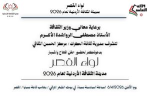 العالم الان- – يرعى وزير الثقافة، مصطفى الرواشدة، حفل افتتاح وإشهار القصر “مدينة للثقافة الأردنية لعام 2026″، بمشاركة واسعة من الفعاليات.