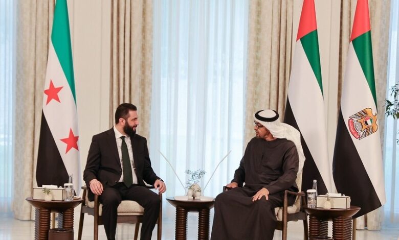 اتصال هاتفي بين أحمد الشرع ومحمد بن زايد عقب اعتداءات طالت سفارة الإمارات بدمشق