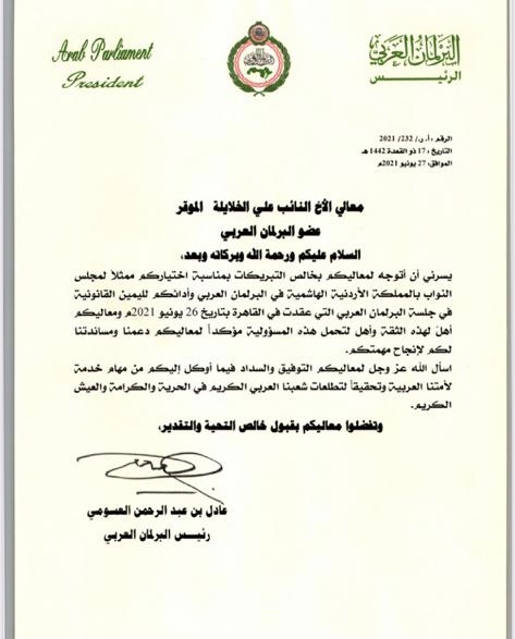 معالي النائب علي الخلايلة ممثلاً لمجلس النواب الأردني في البرلمان العربي
