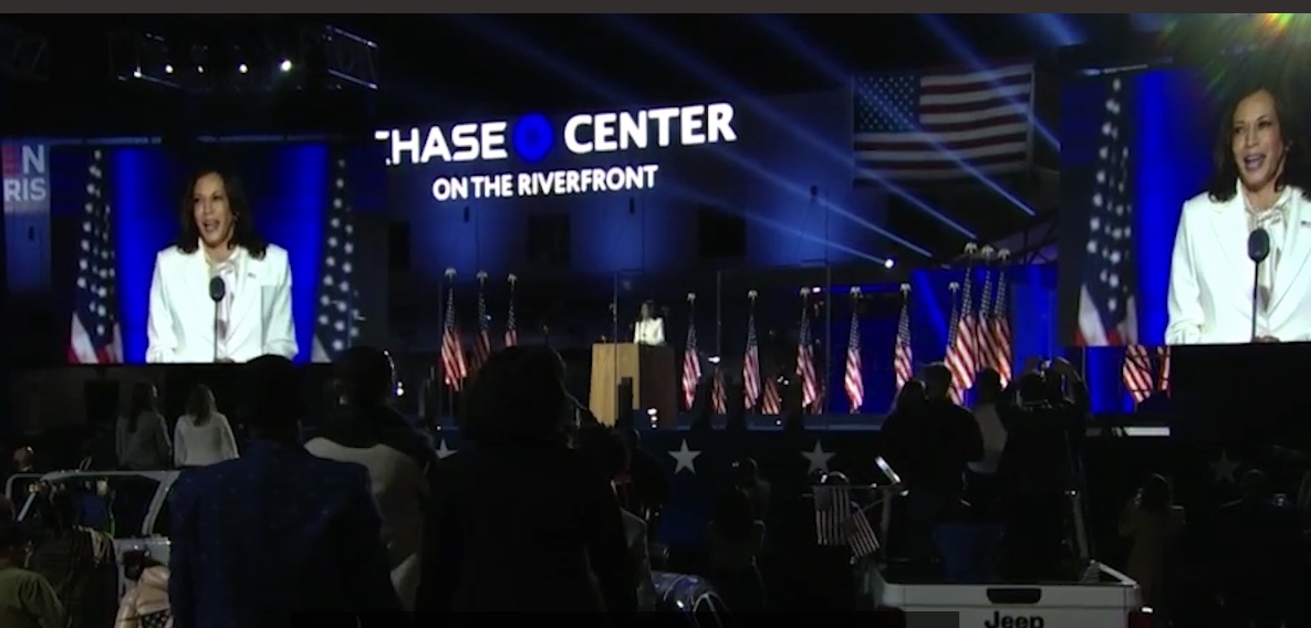 كامالا هاريس تطل ببدلة بيضاء بخطابها كأول امرأة بمنصب نائب رئيس أمريكا