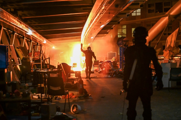 محتجون محاصرون في جامعة في هونغ كونغ يتحدون دعوات الشرطة للاستسلام