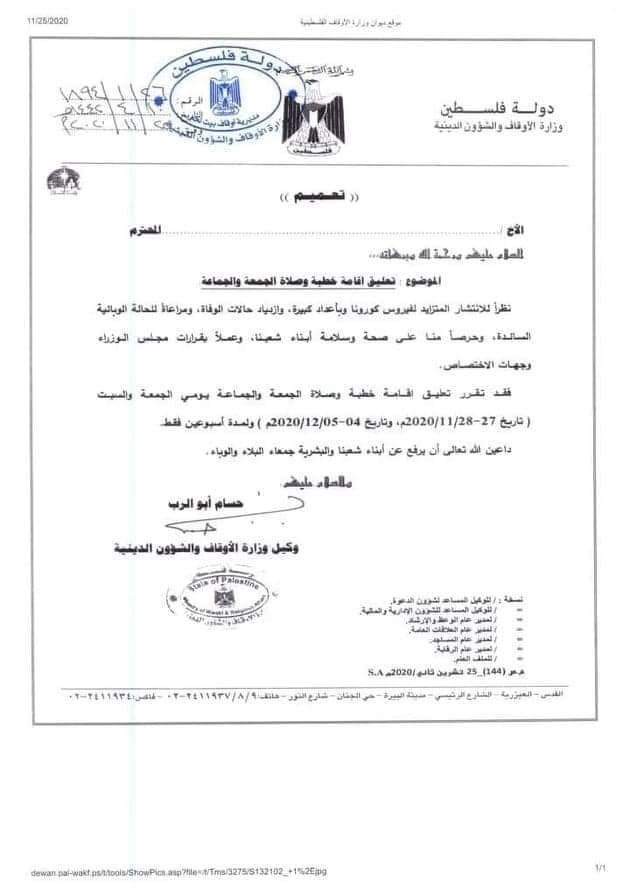 الحكومة الفلسطينيةتقوم بتعليق صلاة الجماعة ليومي الجمعة والسبت بسبب ازدياد حالات الإصابة بكورونا.