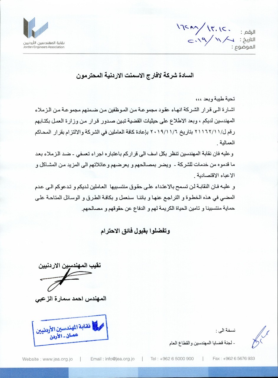 نقابة المهندسين : قرار “لافارج” انهاء خدمات عدد من منتسبيها تعسفي