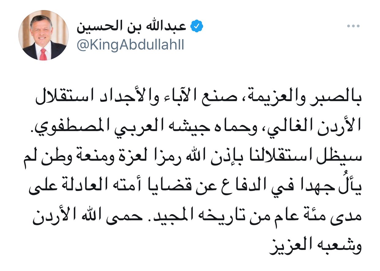 العالم الان – نشر جلالة الملك عبدالله الثاني تغريدة على (توتير) اليوم الثلاثاء، بمناسبة عيد استقلال المملكة الأردنية الهاشمية الخامس…